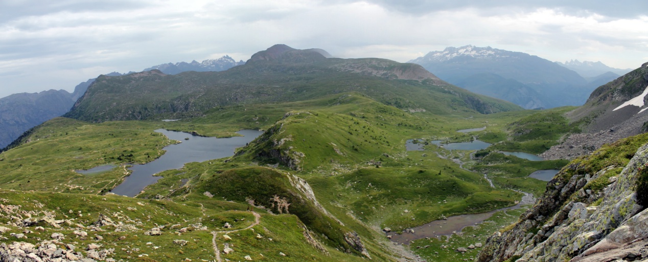 Je galope dans ces pierriers rouges : il y a du fer dans le coin, d'où le nom... Et j'arrive très vite au sommet où Saint Eloi (2857m), le patron des forgerons, évidemment, nous attend. M'attend! parce que ce sommet est très fréquenté, mais j'y suis seul. Ouf! Petit tour d'horizon : Belledonne, Grandes Rousses, Aiguilles d'Arves, Ecrins (la Barre est superbe!)... Le Vercors semble vivre l'apocalypse, et elle se rapproche. Un œil sur l'itinéraire de descente vers le plateau des lacs...